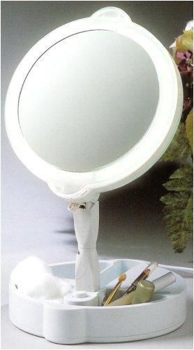 USES: Eyebrow Tweezing, Facial Hair Removal, Makeup Application, Skin Care/Facials, Contact Lens Insertion. Double Sided 9x/1x Mirror. DFR Distortion Free Glass. Folds to 2.75" in Height. Long Life Replaceable Daylight Bulb. Bright 360 Perimeter Lighting. Adjustable Height For Easy Viewing. Built-in Storage Compartments. - 9X magnifying reversing to plain m